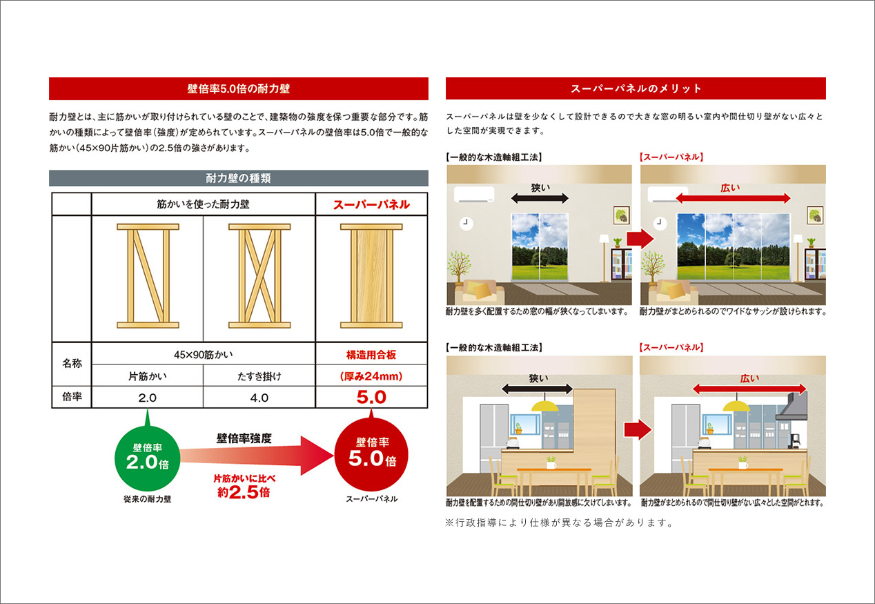 住宅情報館が開発した高倍率耐力壁「スーパーパネル」は耐力壁としての強度(壁倍率)が従来の耐力壁と比べて高いので、設置することにより建物の耐震性能が上がります。