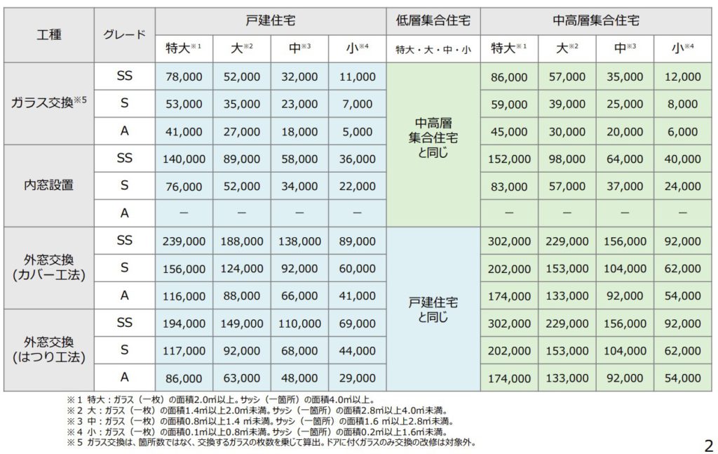 また、補助額は「工種」および交換するサッシやガラスの「グレード(断熱性能)」と「サイズ」によって細かく決められており、これを積み上げて算出することになります。