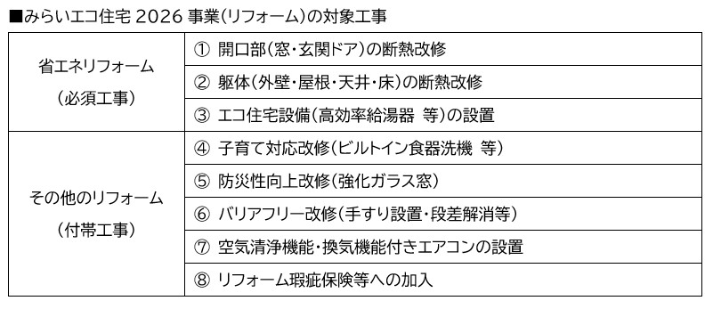 まず2026年度の目玉となる「みらいエコ住宅2026事業」について解説します。本事業は新築住宅の建築・購入とリフォームが対象となります。