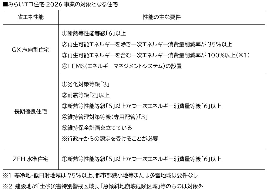 対象となるのは、住宅性能が「GX志向型住宅」、「長期優良住宅」、「ZEH水準住宅」の3つです。