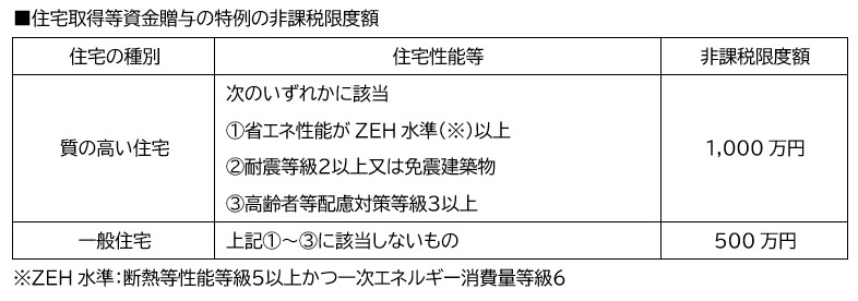 上記の通り、質の高い住宅については1,000万円(基礎控除と合わせて1,110万円)までの資金援助が非課税となります。なお、中古住宅の場合は、省エネ基準(断熱等性能等級4又は一次エネルギー消費量等級4)に適合していればこの特例を受けることができます。