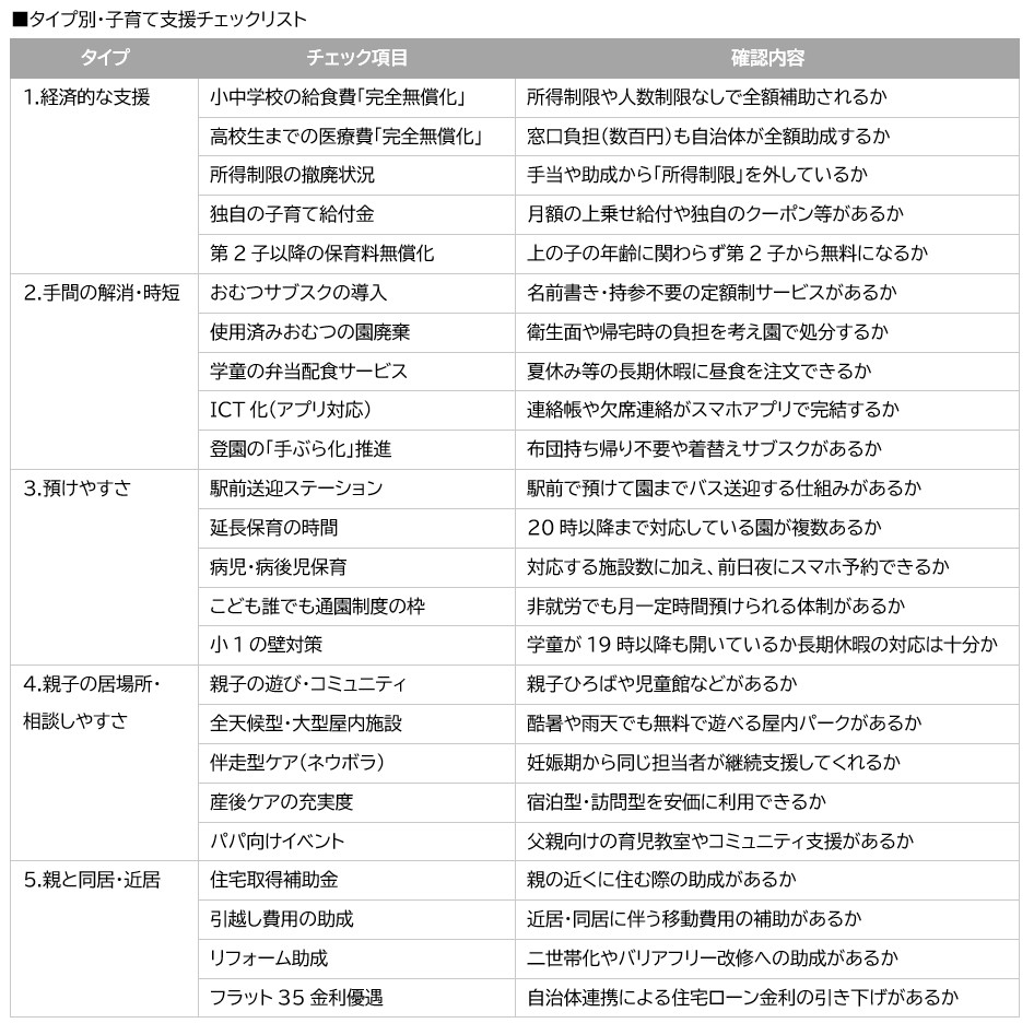最後に、ここまで解説してきた子育て支援の内容をタイプ別にチェックリストにまとめてみました。ひとつの参考として街選びにお役立てください。