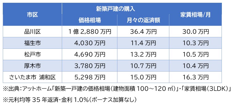 上表の通り、都心の品川区と郊外の福生市や厚木市では、住宅コストに2倍〜3倍の開きがあります 。