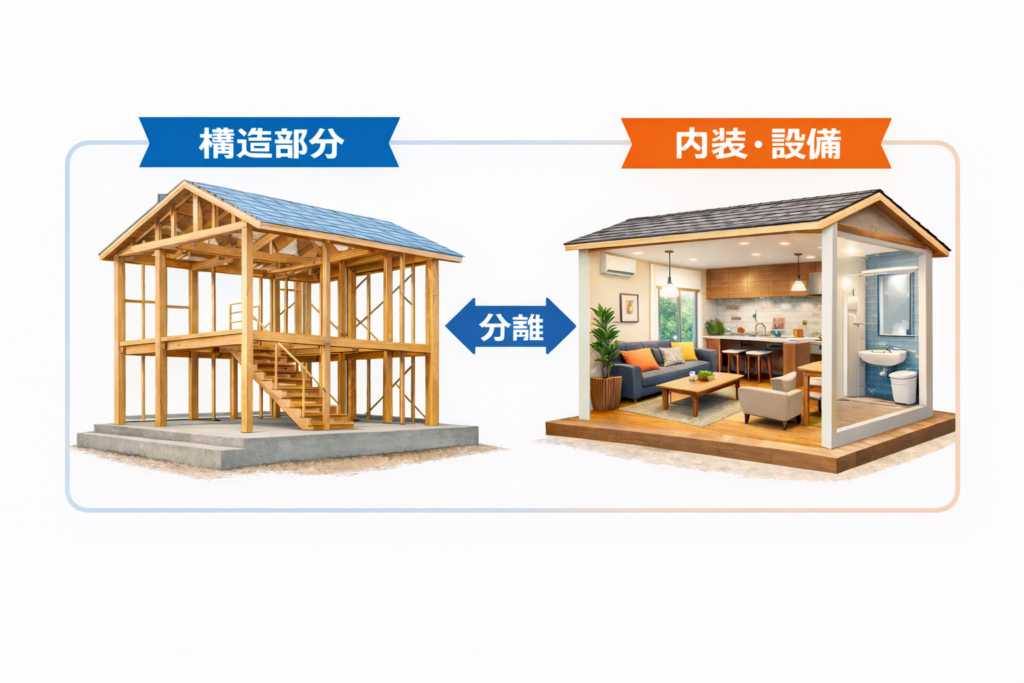 「スケルトン・インフィル」とは、建物を「構造部分(スケルトン)」と「内装・設備部分(インフィル)」に分けて考える設計思想のことです。高性能・長寿命なスケルトンと、可変性の高いインフィルを組み合わせることで、ライフステージの変化に対応しやすくなり、結果として売却しやすい住まいとなります。
