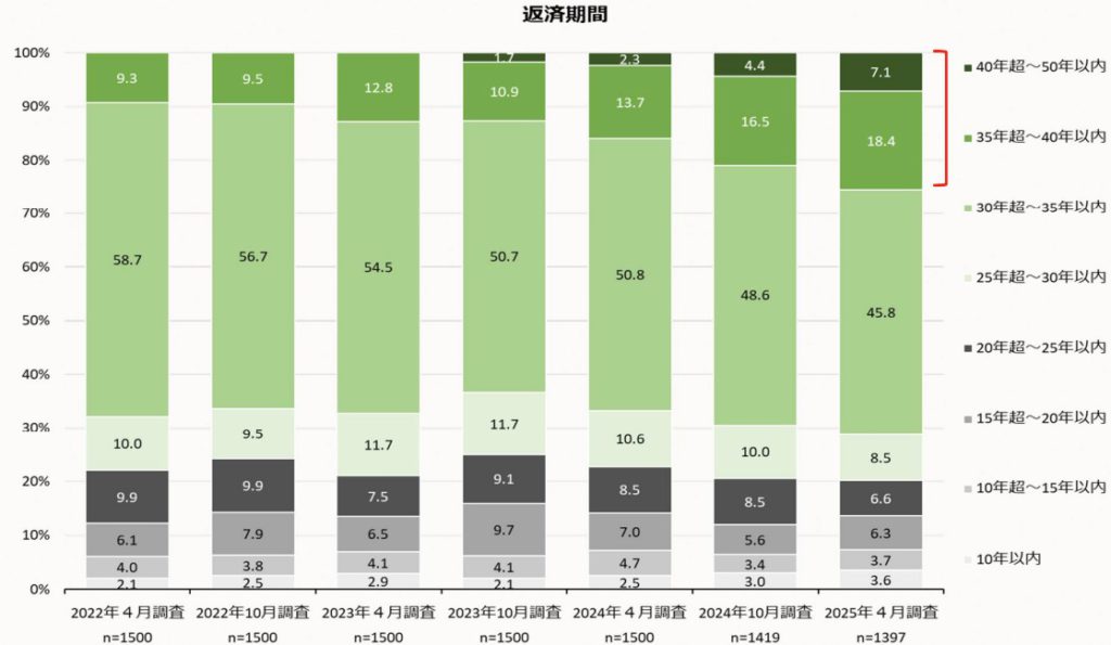 そして2022年ごろから返済期間が35年を超える超長期ローンが登場し、急速に利用者を増やしています。住宅金融支援機構の調査によれば、35年を超えるローンの利用者は、2022年4月の9.3%から2025年4月の25.5%へと大きく増加しています。今や4人に1人が超長期ローンを利用しているのです。