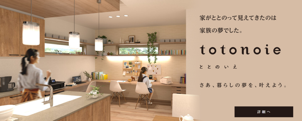 住宅情報館の「totonoie(ととのいえ)」は、ZEH・耐震等級3など高い基本性能を備えており、不要なものを省いて欲しいものだけを組み合わせて建てられる、完全自由設計の注文住宅です。