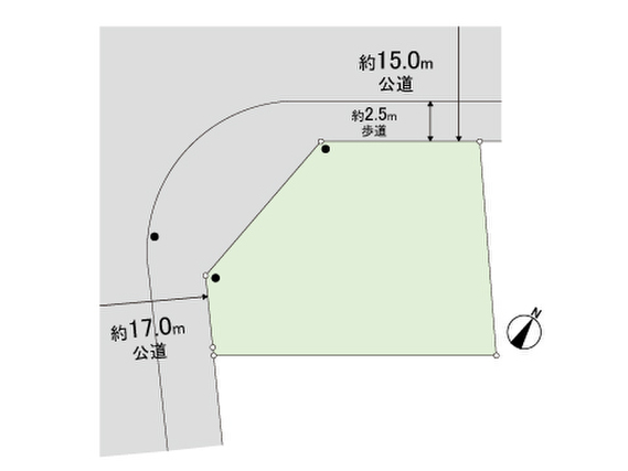 西側前面道路約17m(歩道含) 北側前面道路約15m(歩道含) 敷地内に電柱有