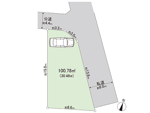前道6m以上、角地、緑豊かな住宅地、平坦地に立地です。